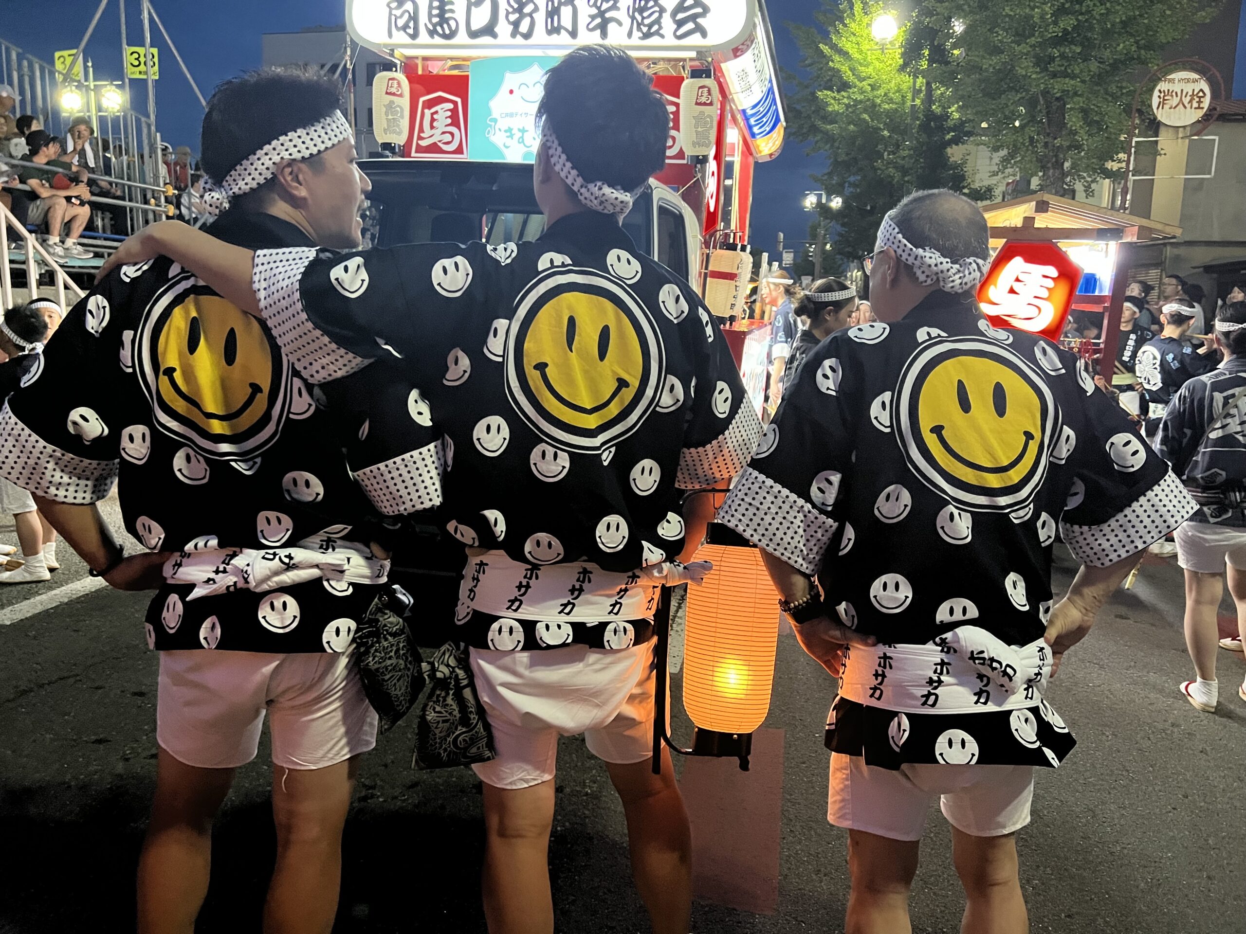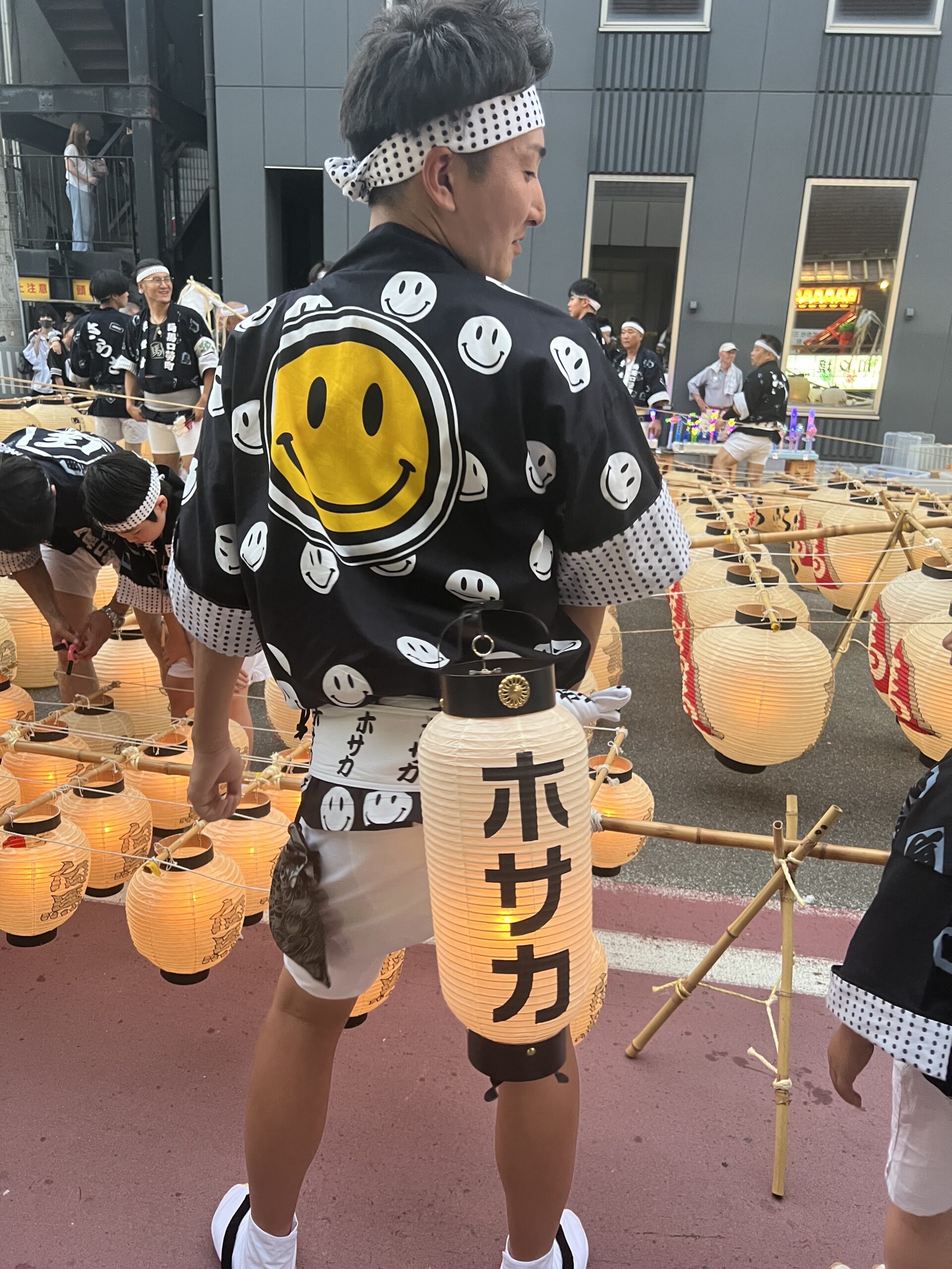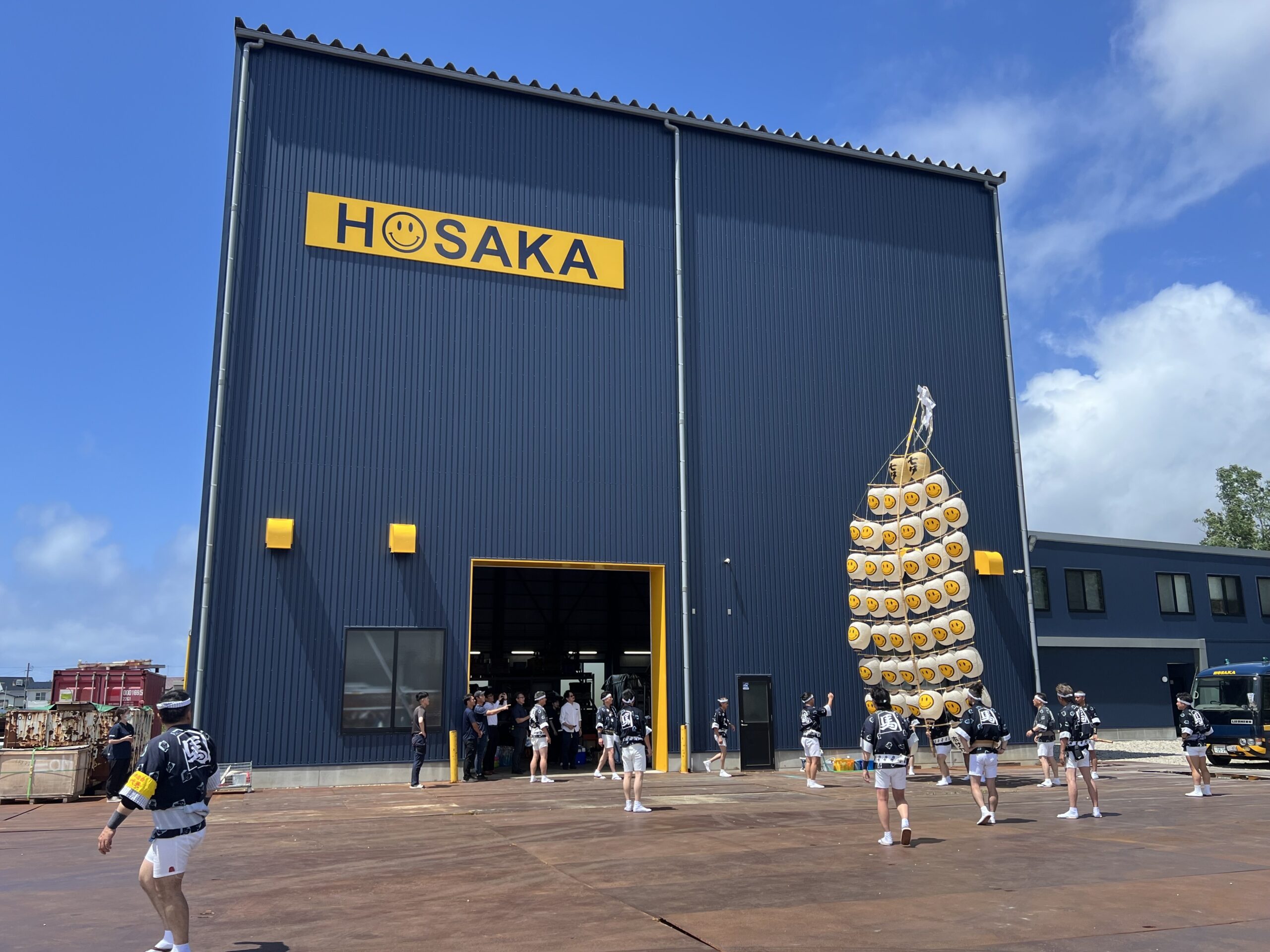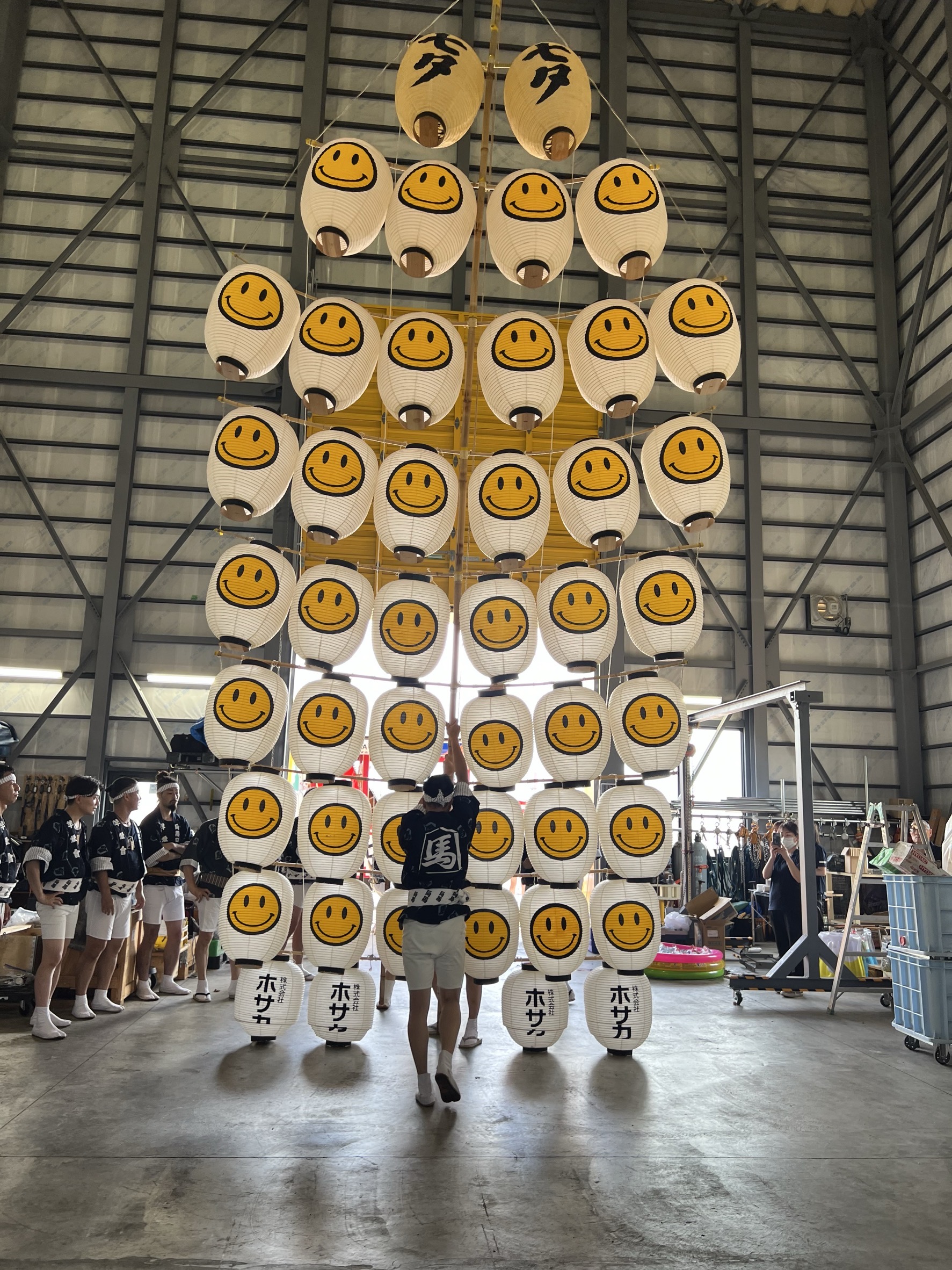 会社のシンボルであるスマイルマークをあしらった半纏と提灯を掲